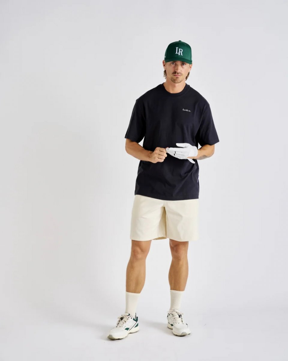 The Local Rule Shibuya shorts are designed with a water-repellent, technical cotton-polyester twill fabric, making them ideal for unexpected rain. These shorts sit at a regular waist and feature a comfortable wide leg for ease of movement and a relaxed look. The zip and slide-in snap button front closure ensure a secure fit. They also include slanted side pockets, a smaller ball marker pocket, and two back pockets for convenience